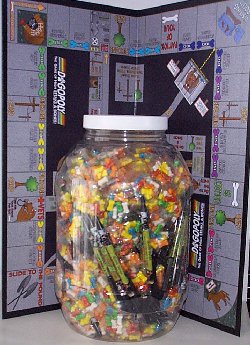At the Fair, people could enter their names and e-mail address on a form along with their guess as to how many candy bones and how many pens were in a large plastic jar. The one closest to the number of candy bones got a free DOGOPOLY board game; closest to the number of pens got a free DOGOPOLY T-shirt. Eight others got special discounts off the purchase of a game.